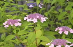 梅雨入りしても雨が降らない日が続いていました。昨夜はお湿り程度の雨が降りました。今朝、園内の入り口に咲くガクアジサイの花が満開となりました。