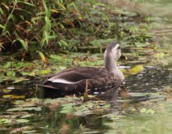 カルガモです。 近くには魚を獲るホシゴイ(ゴイサギの幼鳥)がいます。