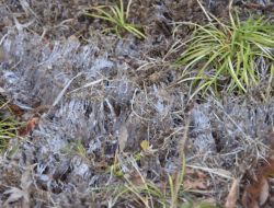 園内の土の部分は、あちらこちらに霜柱が立っています。 大きな霜柱は5センチほどあって、踏むとザクザク、サクサク、その音が何とも快感です。