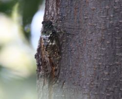 静かに休息しているミンミンゼミです。周りの木々からミンミンゼミのにぎやかな鳴き声が聞こえてきます。